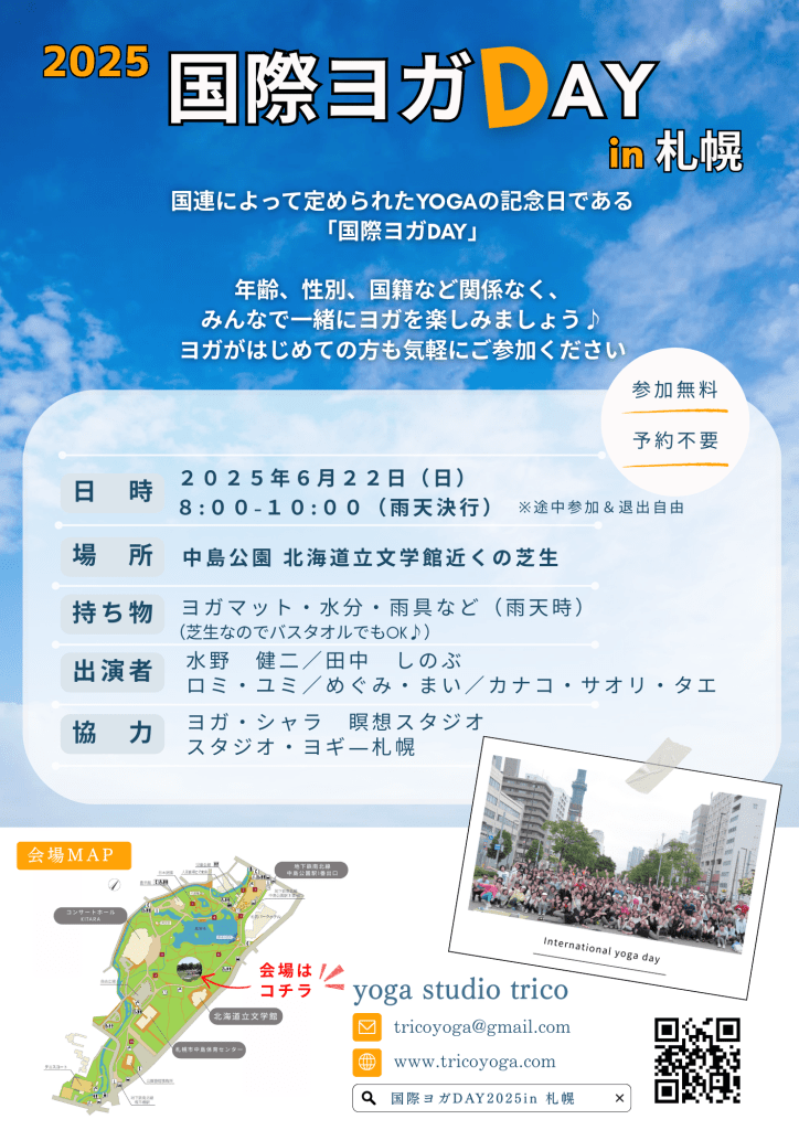 世界中の人がヨガを楽しみ、身体と心を整えるために制定された「国際ヨガデー」。初夏の札幌、みなさまとヨガが出来るのを楽しみにしております。