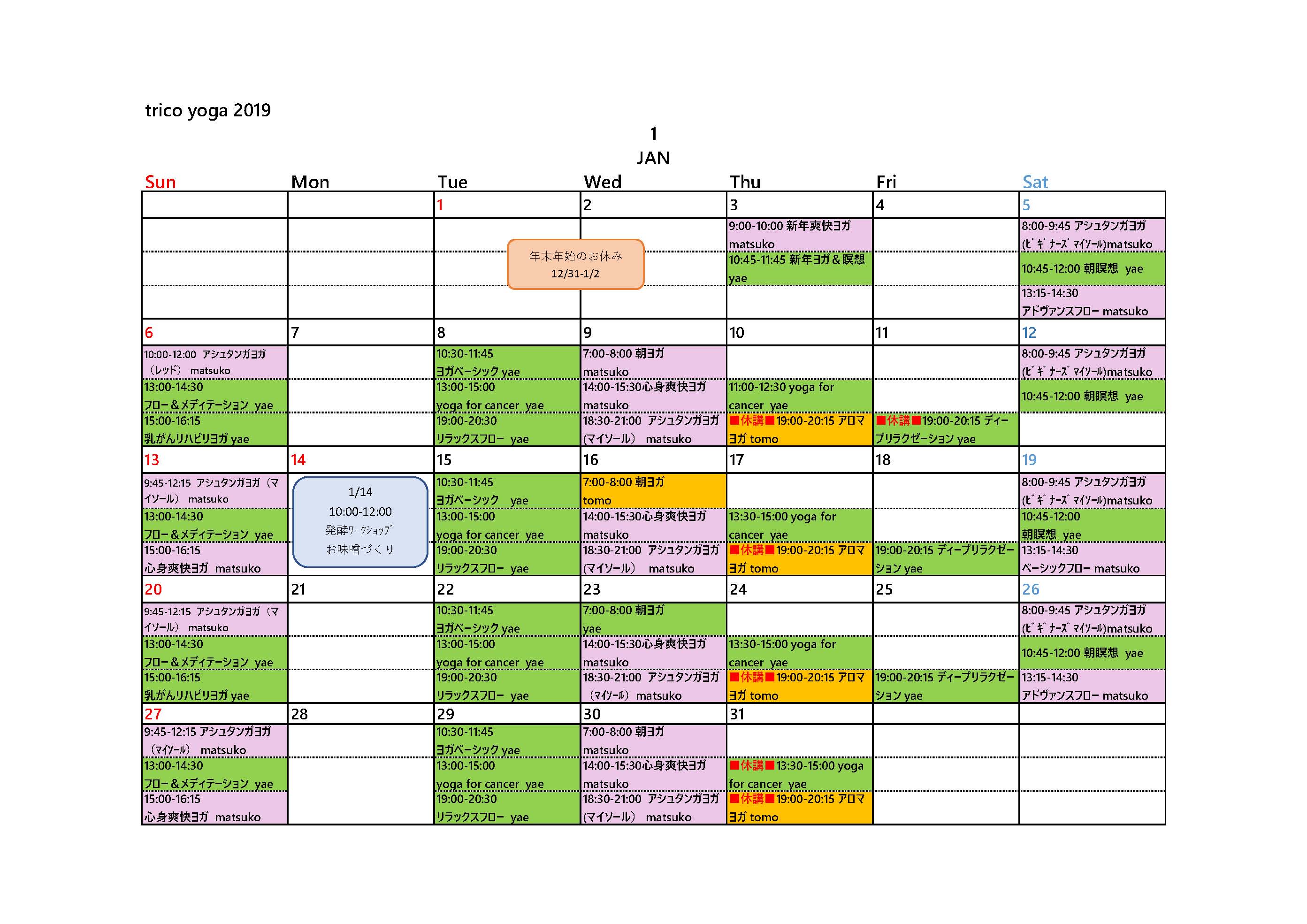 1/28火曜 10:30 – 11:45 ヨガベーシック 13:00‐15:00 YOGA for cancer 19:00‐20:30 リラックスフロー