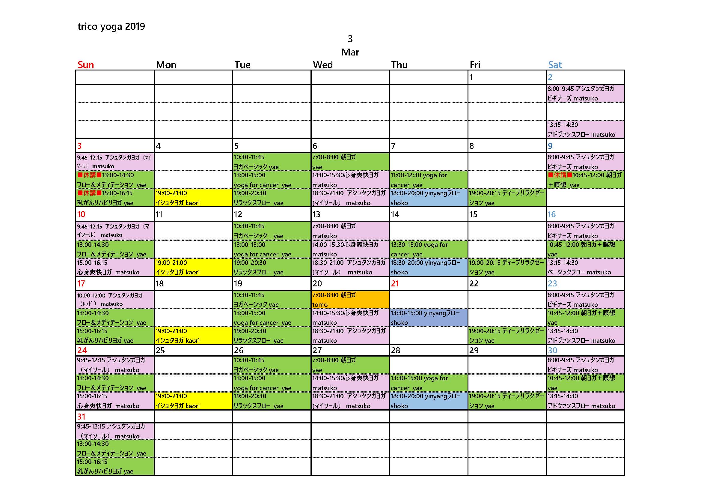 trico【2019年3月 monthly schedule】 2019年2月25日2019年2月25日 tricoyoga 3月のスケジュールは以下のとおり どうぞよろしくお願いします(^^) いいね 読み込み中… 投稿者: tricoyoga tricoyoga の投稿をすべて表示