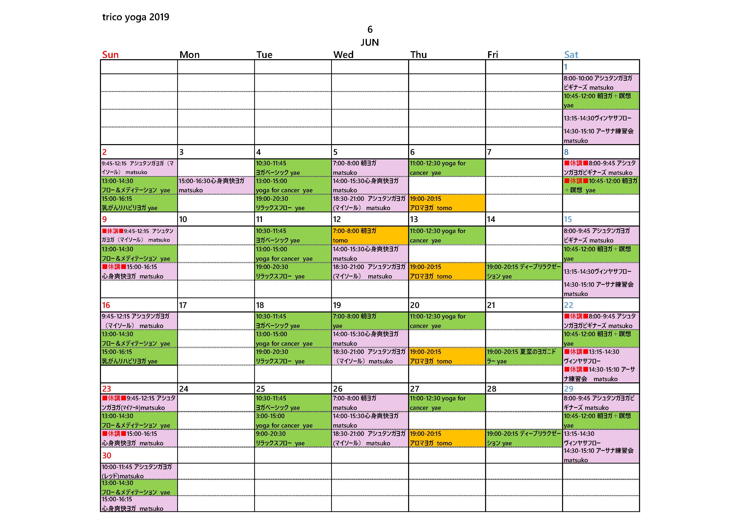 trico【2019年6月 monthly schedule】 2019年6月27日 tricoyoga 6月は 23日(日)国際ヨガday2019in 札幌 昨年大雨でカッパーズだった私達・・・ 今年もtricoの3人で参加させていただきます 21日(金)19:00- 夏至のヨガニドラーもお楽しみに♬ 6月もよろしくお願いします 共有: X で共有 (新しいウィンドウで開きます) X Facebook で共有 (新しいウィンドウで開きます) Facebook いいね 読み込み中… 投稿者: tricoyoga tricoyoga の投稿をすべて表示