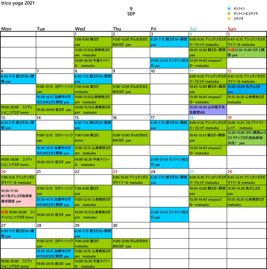 trico, 月間スケジュール【2021年9月 monthly schedule】 2021年8月30日 tricoyoga 2021年9月も心よりお待ちしております。スタジオ、オンライン、同時開催、参加スタイルもご選択ください。 スタジオの対策とみなさまへのお願いは以下をご確認ください。 スタジオでの衛生対策について スタジオ…オレンジオンライン…ブルー同時開催…グリーン 共有: クリックして X で共有 (新しいウィンドウで開きます) X Facebook で共有するにはクリックしてください (新しいウィンドウで開きます) Facebook いいね 読み込み中… 投稿者: tricoyoga tricoyoga の投稿をすべて表示