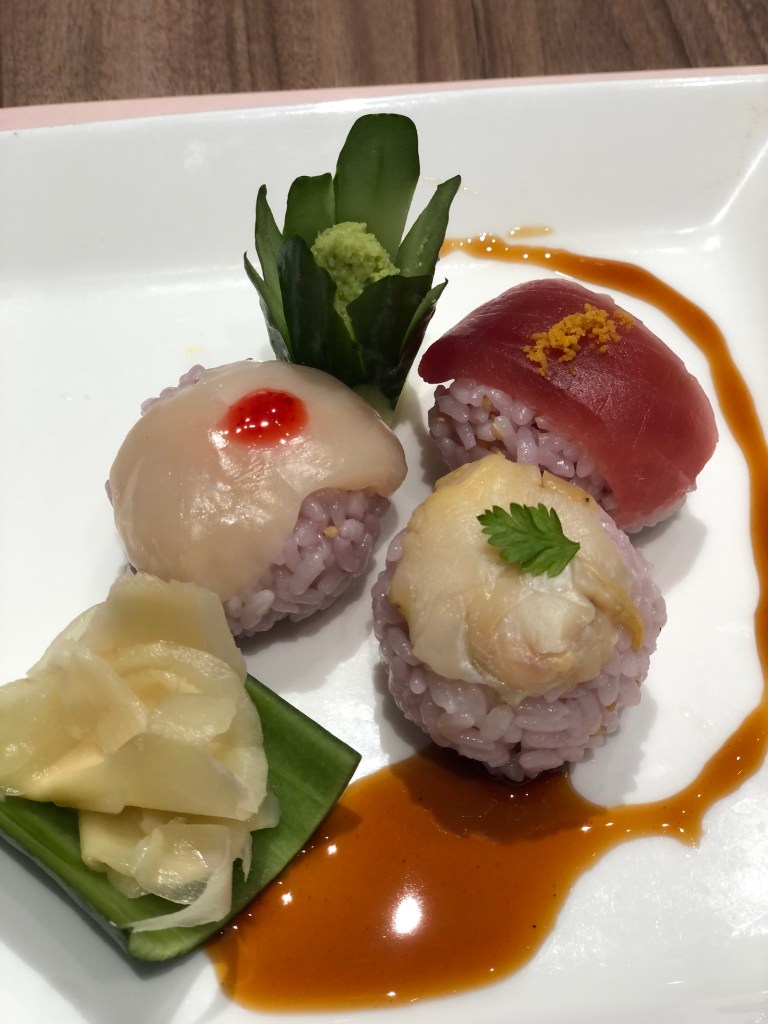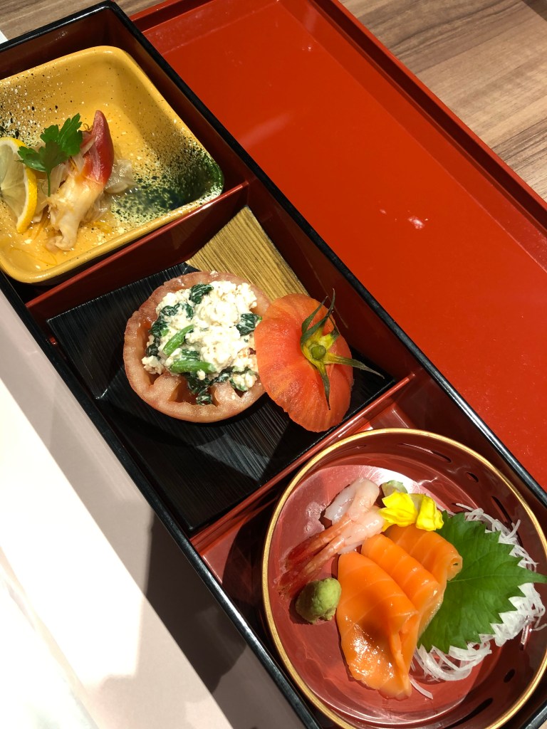 ニセコ産トマト、真狩ハーブ豚、北海道産づくりのミルフィーユの煮物、余市産赤ワインの酢飯てまり寿司など